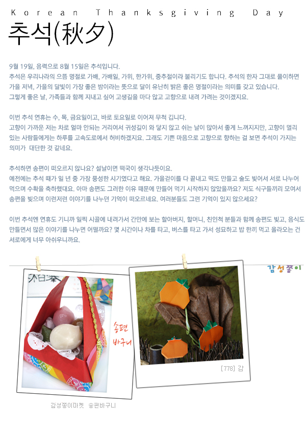 9월에는 추석이 있습니다. 설날과 더불어 유명한 우리의 고유 명절이지요. 많은 사람들이 고향에 계신 할아버지, 할머니, 부모님..